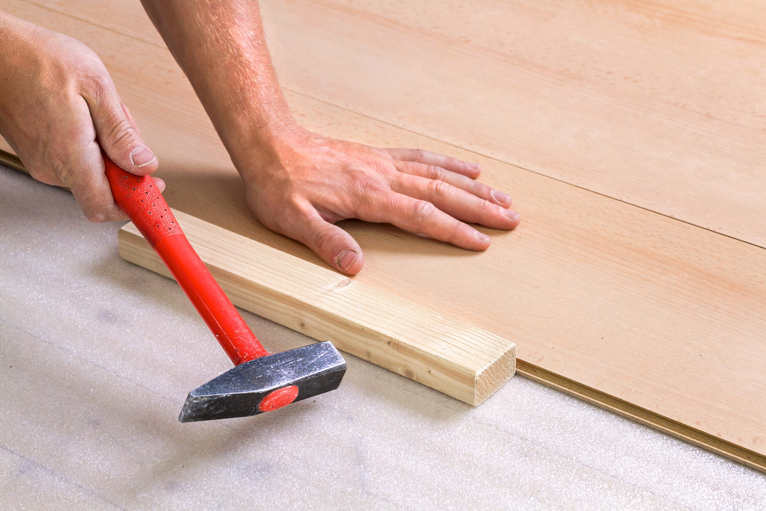 В случае необходимости, в процессе сборки панели могут подгоняться друг к другу ударами молотка. Однако нельзя наносить удары инструментом непосредственно по ламели – необходимо использовать для этой цели подбивочный брусок. При этом подбивка осуществляется несильными частыми ударами, до защелкивания доски.