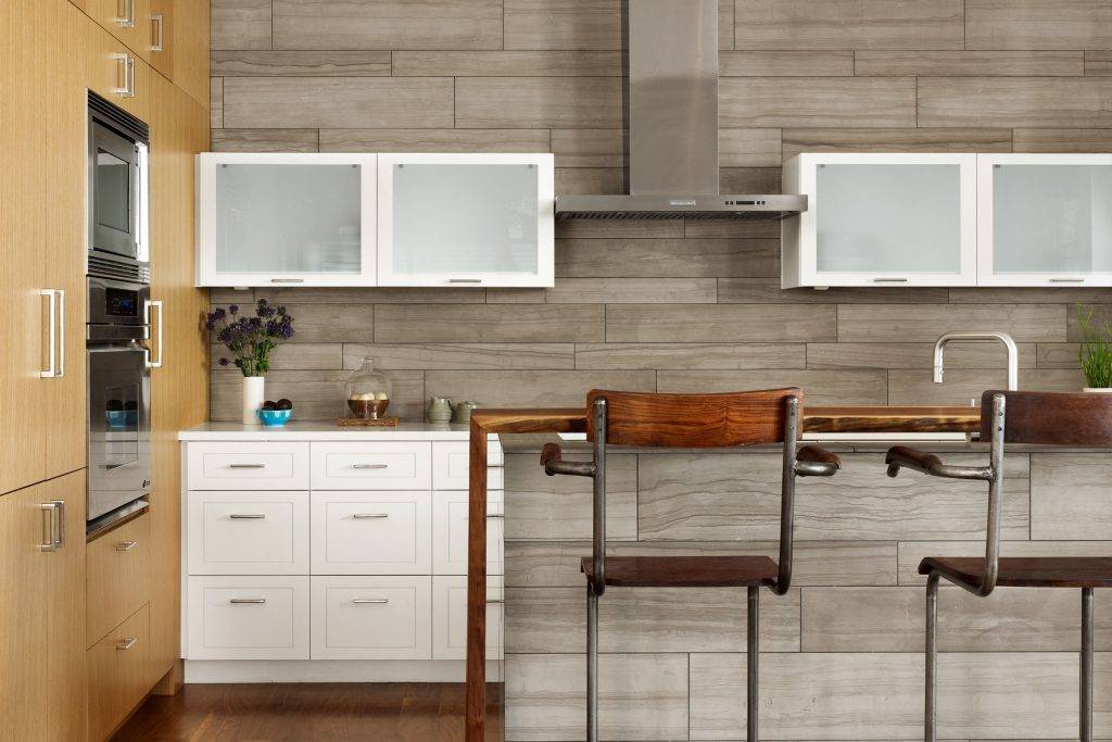 С помощью ламината можно по-разному оформить стены на кухне. Доски могут располагаться вертикально, горизонтально и по диагонали. Каждый вараинт заслуживает отдельного внимания. Горизонтально расположенные доски визуально расширяют пространство.
