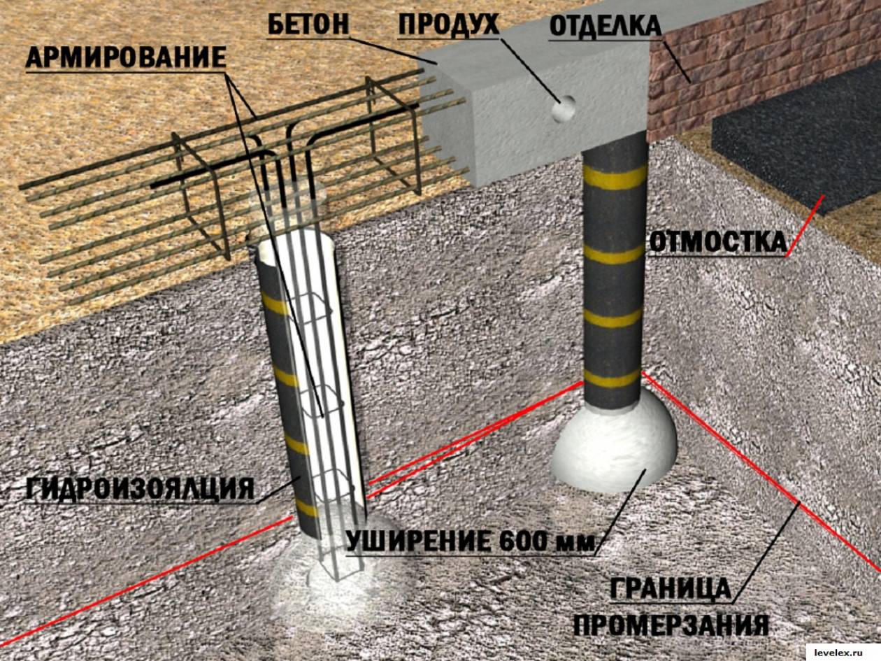 Сваи имеют куполообразную расширенную подошву. Эта «стопа» увеличивает площадь опоры строения, что приводит к его большей устойчивости, особенно на пучинистом грунте. После возведения свай их связывают горизонтальной бетонной «лентой», называемой «ростверк». Его располагают над почвой на сваях для исключения влияния пучения земли.