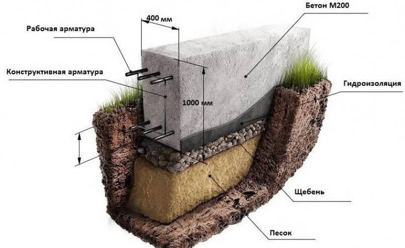 Чаще всего, заглубленные и мелкозаглубленные ленточные фундаменты делают шириной 400 мм. Бетон используют марки М200-М250.