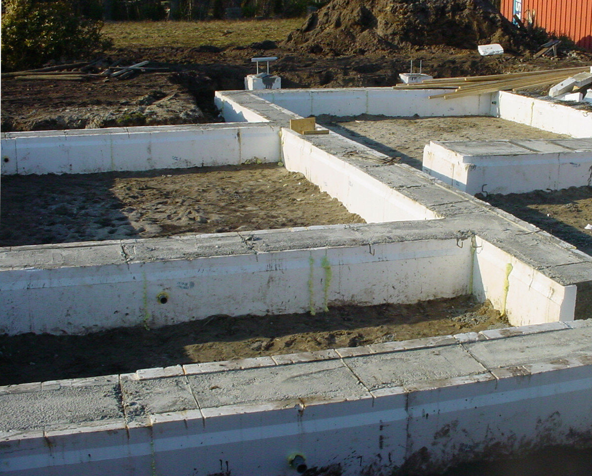 Несъемная опалубка устраивается из пенополистирольных блоков, установленных друг на друга. Она же будет являться и утепляющим материалом для каменного ленточного фундамента. Кстати, в помещениях можно заливать стяжку с системой теплого пола – потерь энергоресурсов не будет.