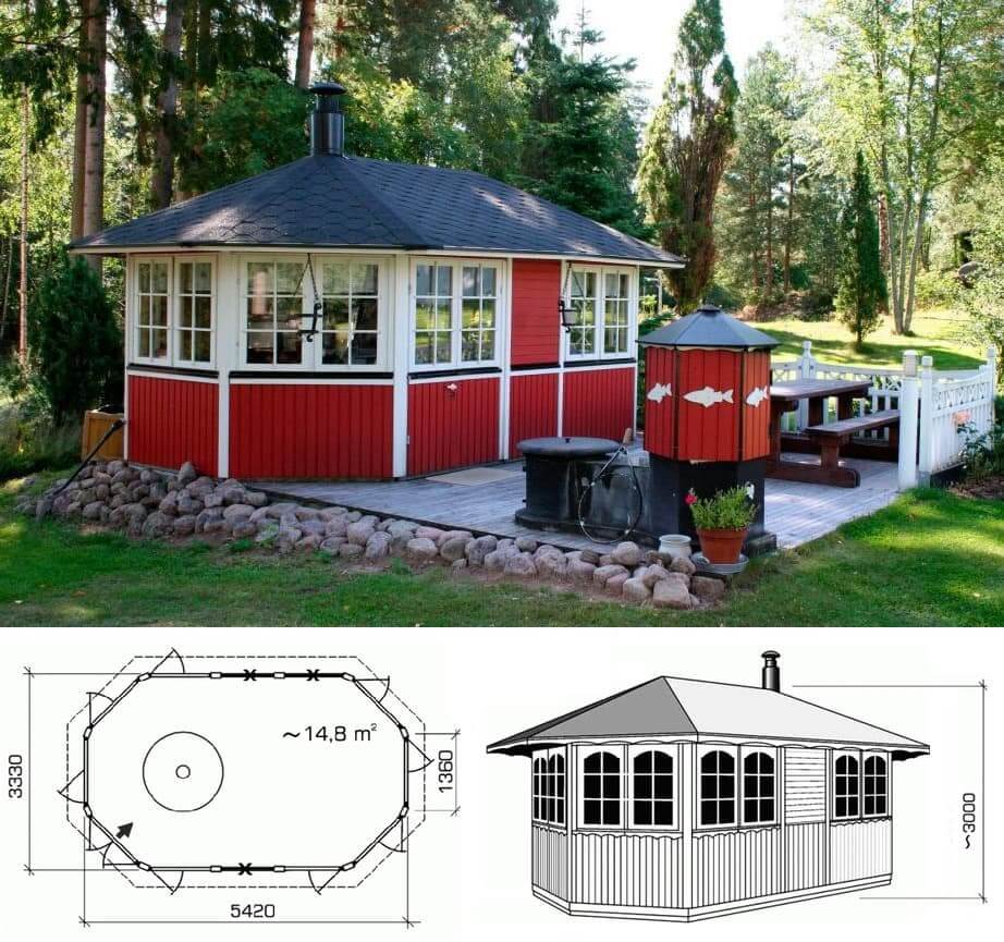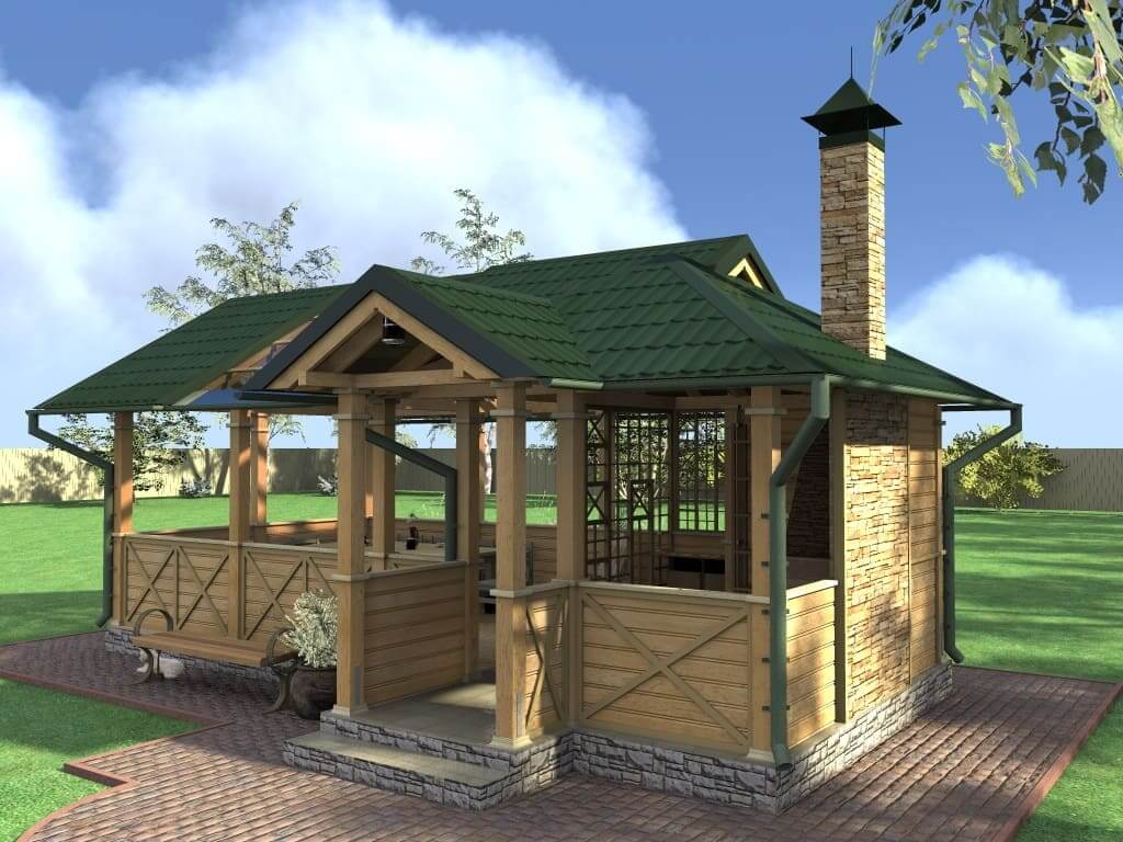 И уже проанализировав важные моменты, можно выбирать тип конструкции, варианты установки печи или барбекю, поводку труб и декорирование. Один из распространённых вариантов − летняя постройка открытого типа. Это аналог беседки, у неё остаются открытыми одна, две или три стены, обязательна установка крыши или навеса. К достоинствам строений открытого типа относят:
