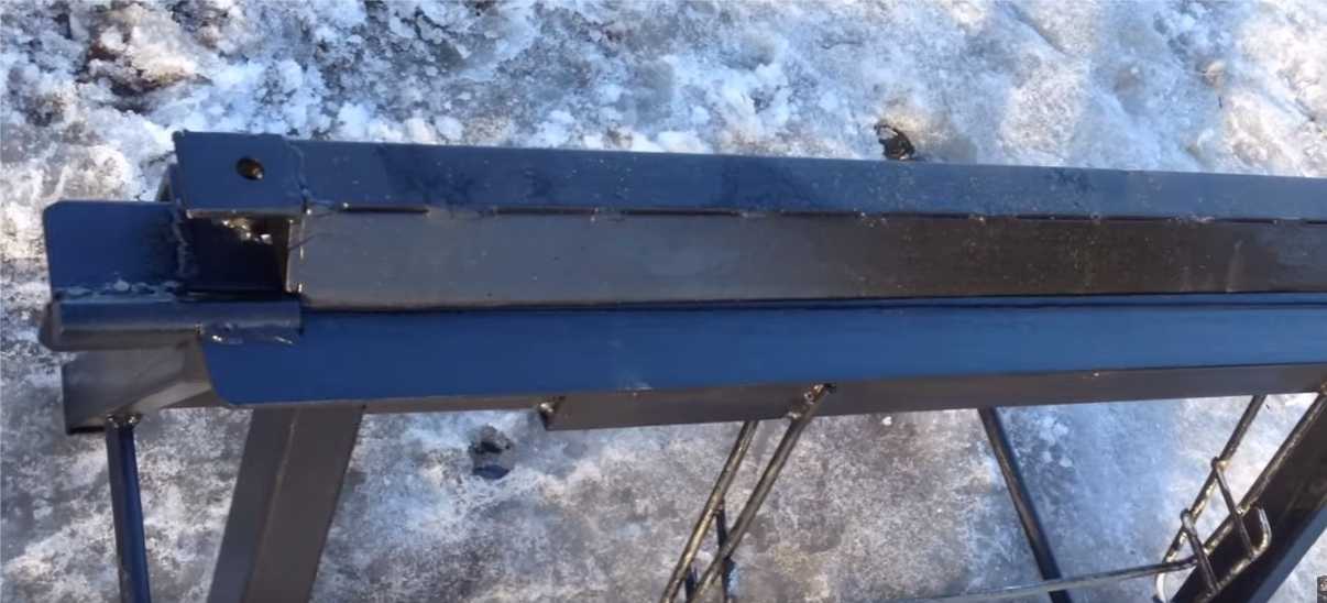 - Дальний уголочек должен иметь по бокам приваренные пластинки для упора и поддержки третьей балки-тавра.