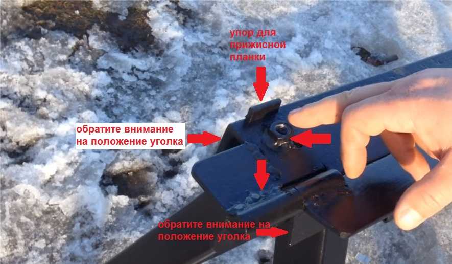 Прижимная планка укладывается на станок, в место установки гайки подкладывается пружина. Ручка устанавливается на место. Если она не прижимает планку, та за счет силы упругости пружины приподнята над поверхностью. В таком положении под нее заправляют заготовку, выставляют, прижимают.