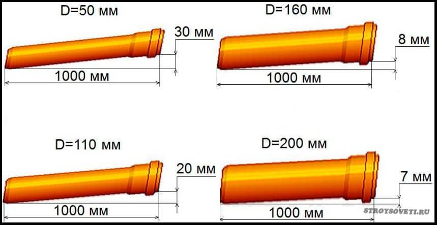 Не стоит забывать и об уклоне труб, так как вода должна стекать в сборники, и далее – в дренажные тоннели. Угол зависит от диаметра коммуникаций и от особенностей ландшафта. К примеру, для трубы диаметром 25 см, расположенной на ровной поверхности, понадобится уклон не менее 8 мм (на каждый погонный метр). При этом максимально допустимое значение уклона канализации составляет 15 мм на метр.