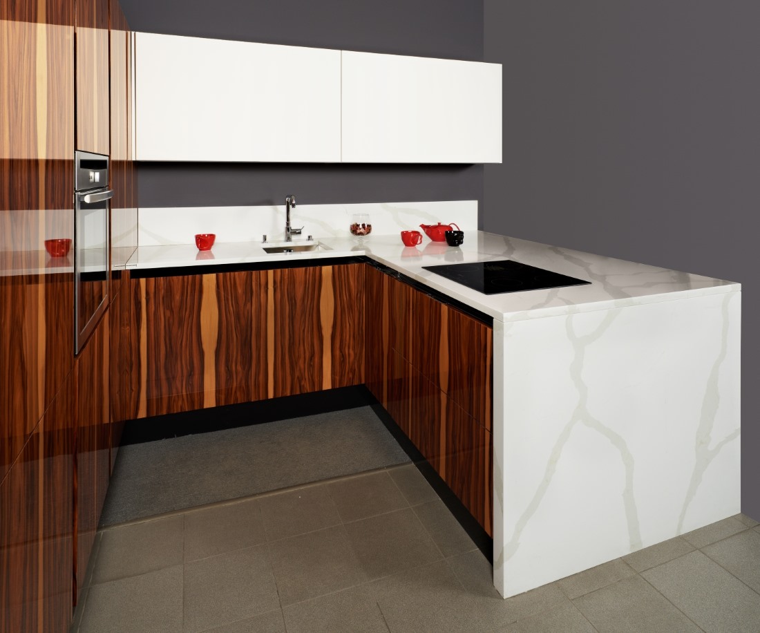 Для придания желаемого оттенка, в состав смеси добавляются пигменты. Столешница из кварца — это идеальный выбор для кухни. Агломерат имеет сходство с природным камнем, однако в несколько раз превосходит натуральный кварц по эксплуатационным характеристикам. Он влагонепроницаемый и устойчивый к перепадам температуры, поэтому хозяйке не нужно беспокоиться о появлении плесени или остальных неприятных процессах. Кроме того, кварц обладает повышенной прочностью, поэтому можно гарантировано рассчитывать на долговечность использования. Простота в уходе также делает его популярным выбором.