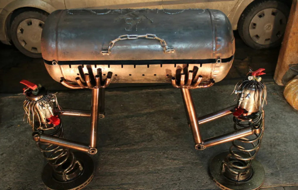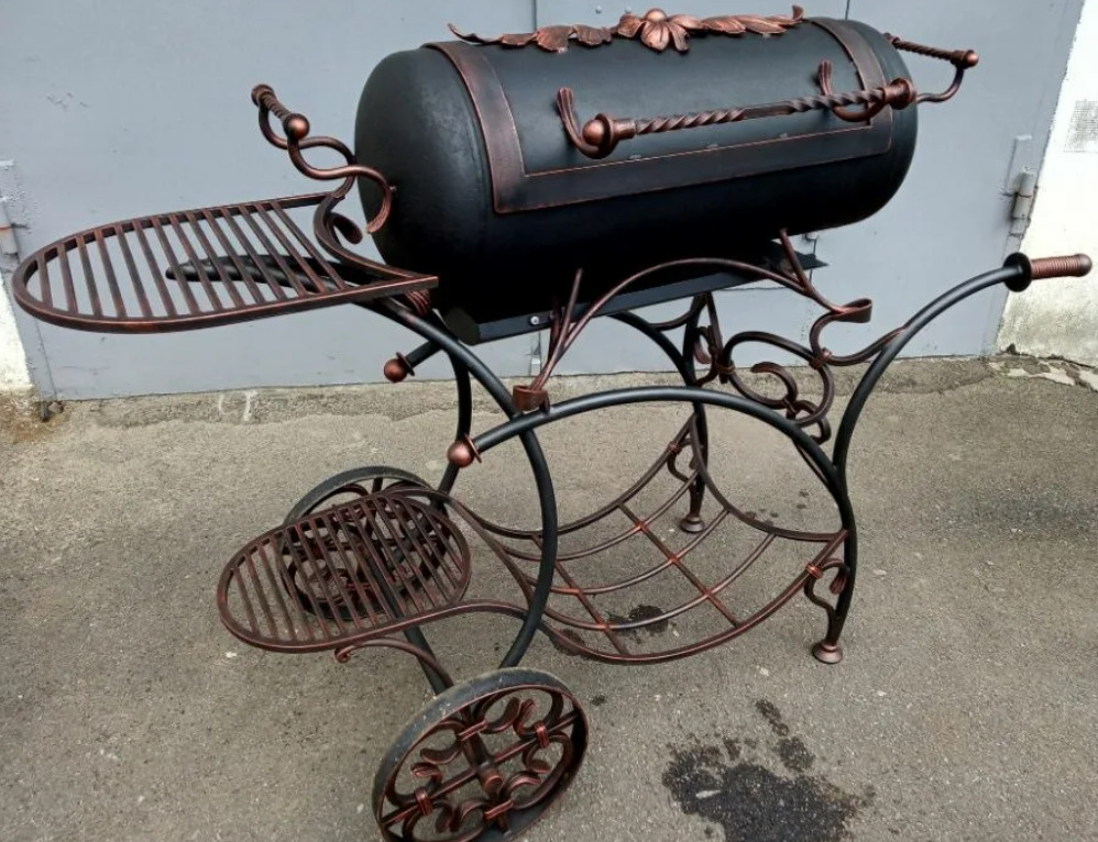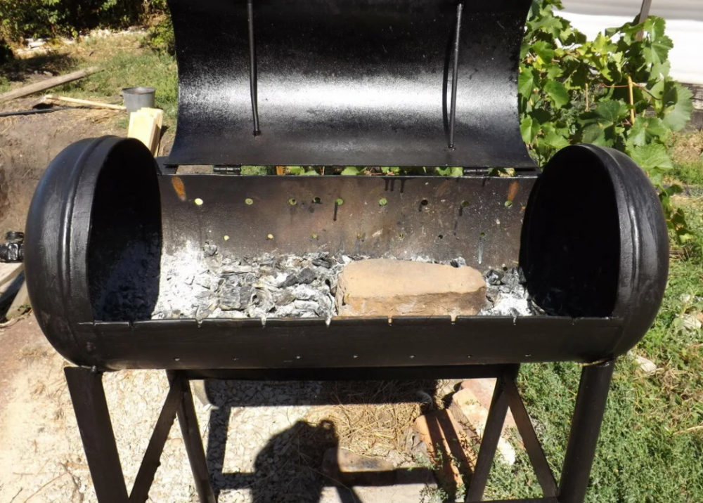 Создать такую конструкцию новичку не по силам. «Самоделка» такого типа способна решать сразу несколько задач: это и мангал, и коптильня, и гриль, и барбекю. Каждый отсек выполняет свою задачу. Такие мангалы обладают высокой производительностью за счёт герметичной конструкции, здесь практически нет потерь тепла.