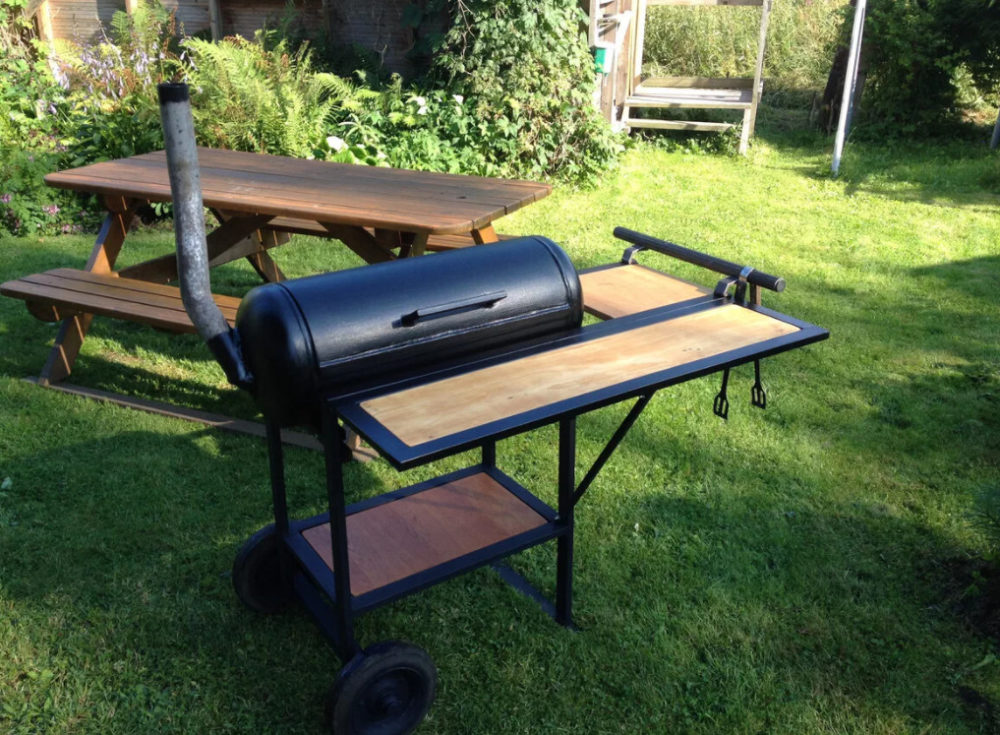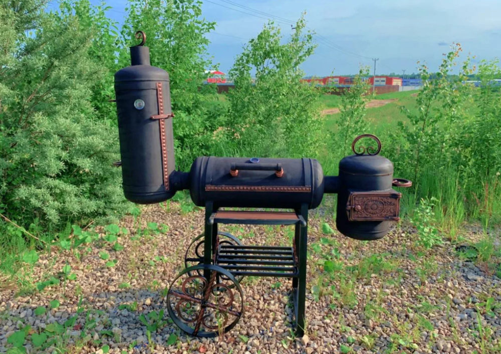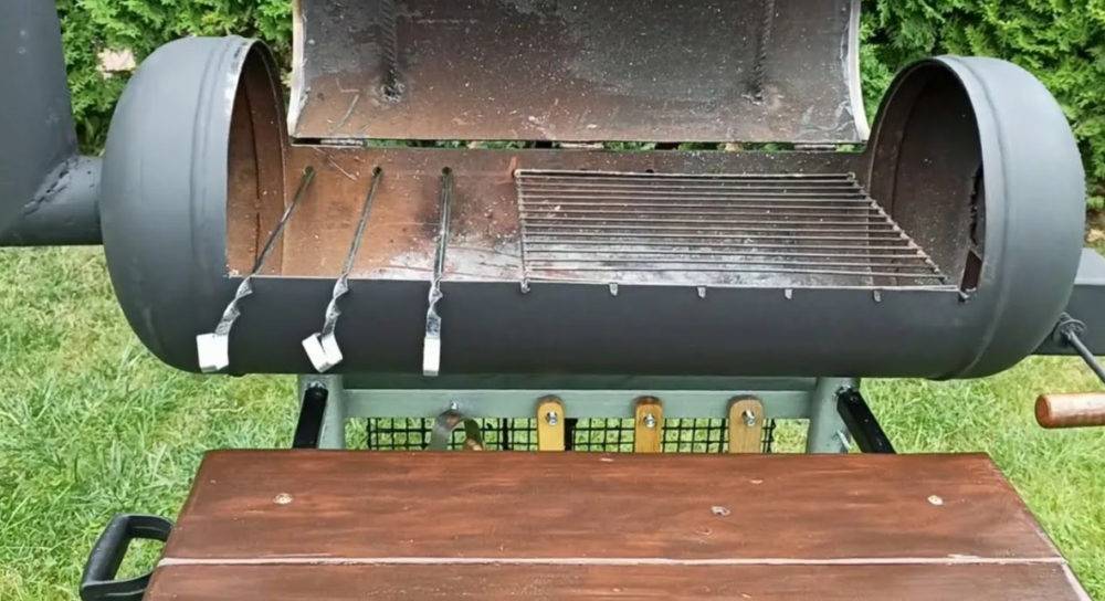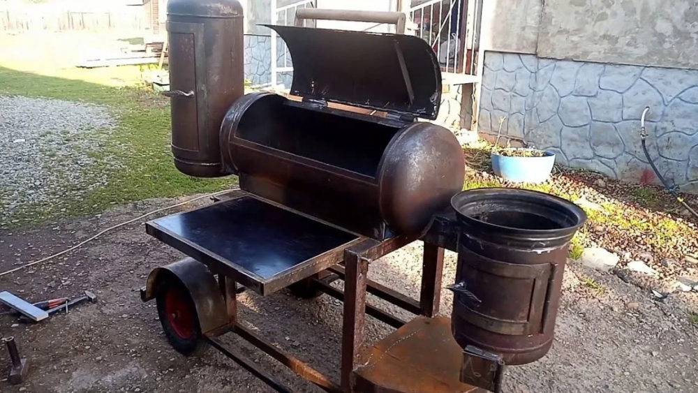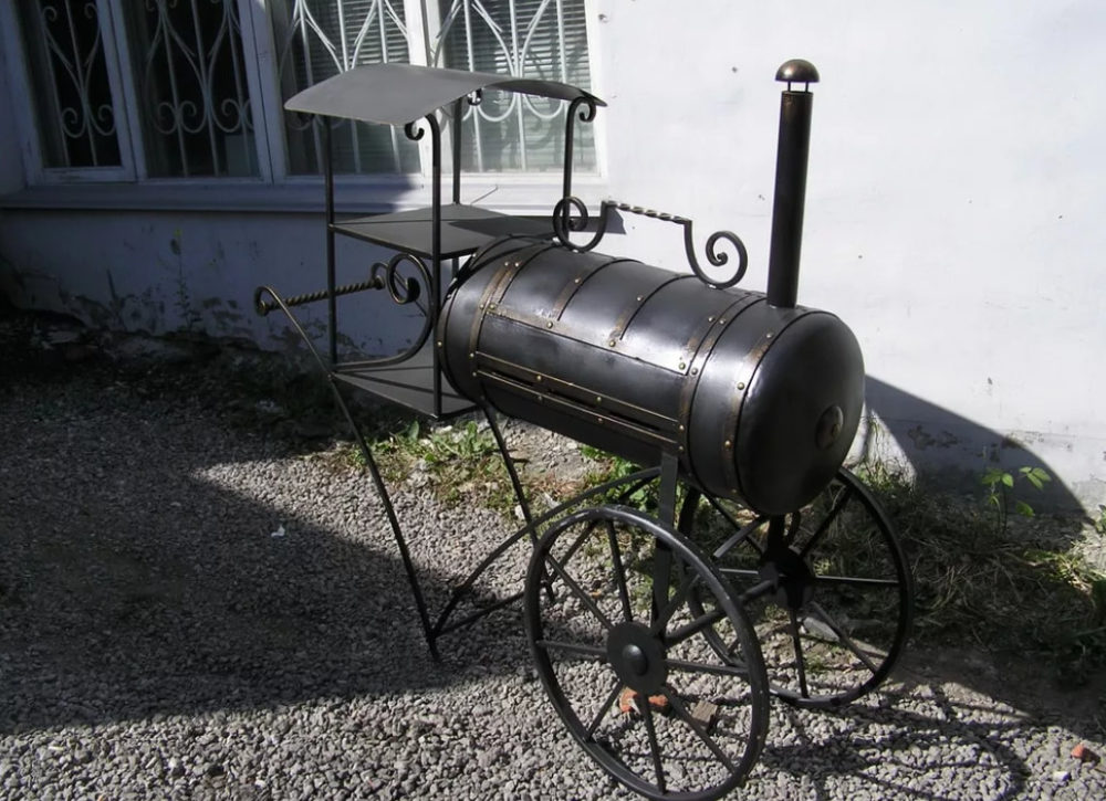 - Смокер – носит второе название паровоз. Лучше делать его на основе точно построенных чертежей. Это детище народного умельца, ведь агрегат сочетает в себе функции сразу нескольких приспособлений – мангала, гриля, коптильни и барбекю.