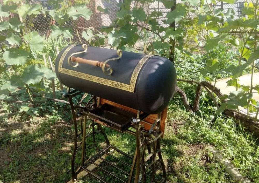 | Основанием под мангал-коптильню своими руками из газового баллона может служить подставка под старую швейную машину или вот такая сварная конструкция. |
