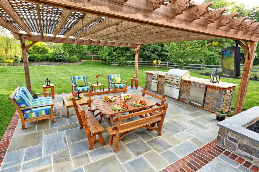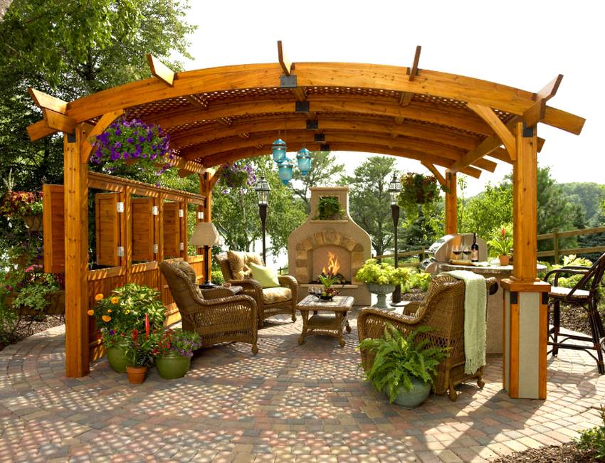 - Беседки-патио чаще всего оформляются в итальянском или греческом стиле с использованием камня или дерева для отделки. Подойдет компактная мебель и цветки в горшках.