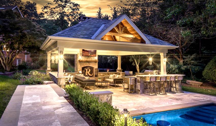 - закрытая зона обустраивается стационарным очагом, имеет навес и стены. Часто для организации такой зоны отдыха служит беседка или терраса, которые фактически превращаются в удобную летнюю столовую, где будет комфортно готовить пищу и обедать при любых погодных условиях;