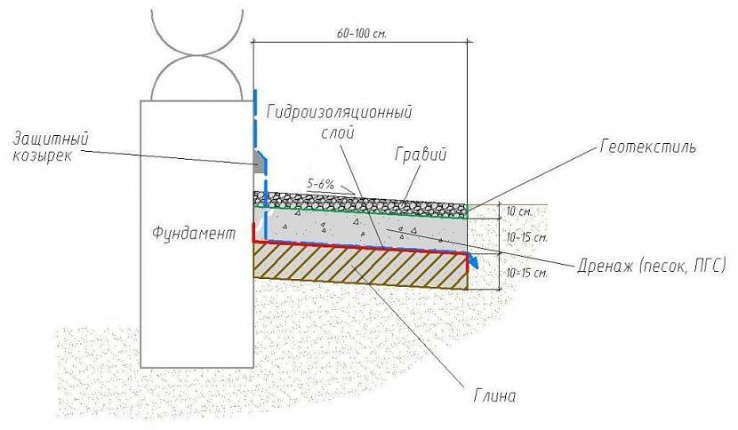 - Теплоизоляционной прослойки, благодаря которой исключается промерзание и вспучивание грунта возле фундамента.
