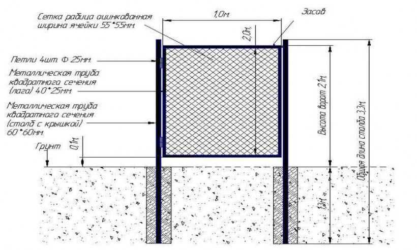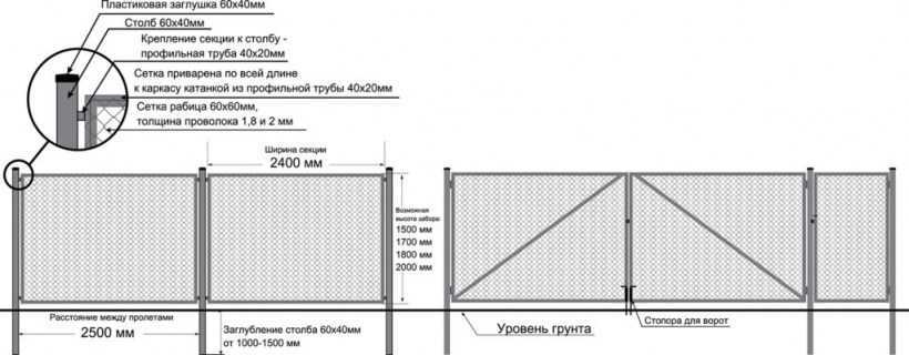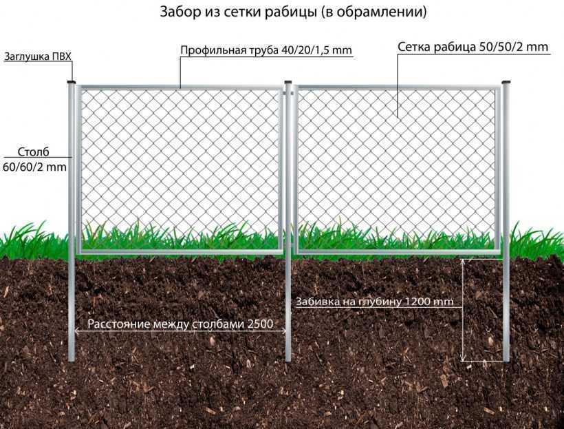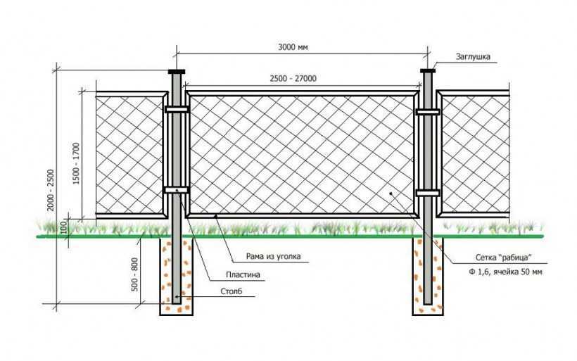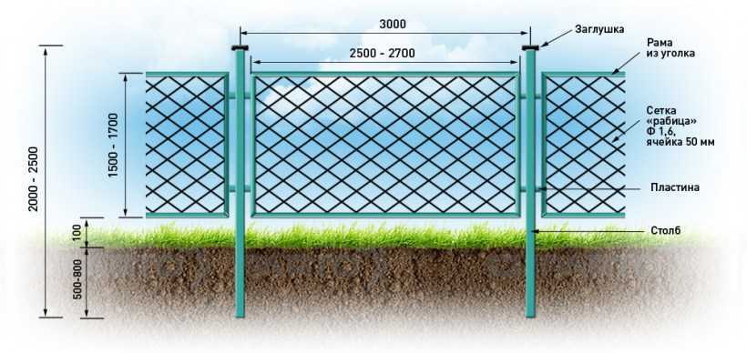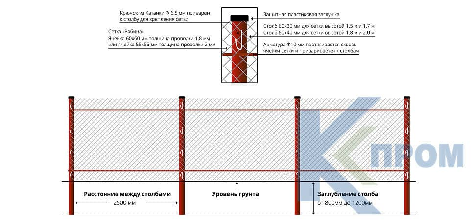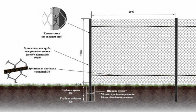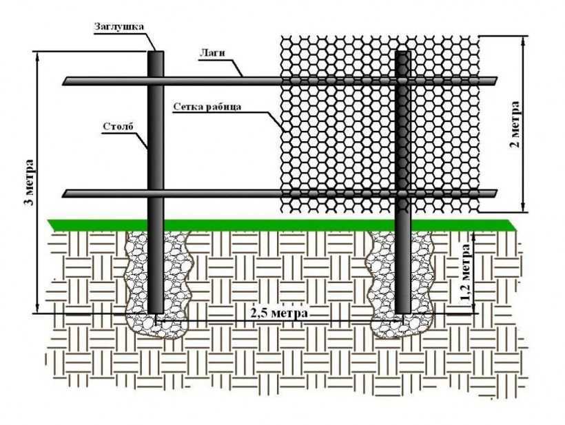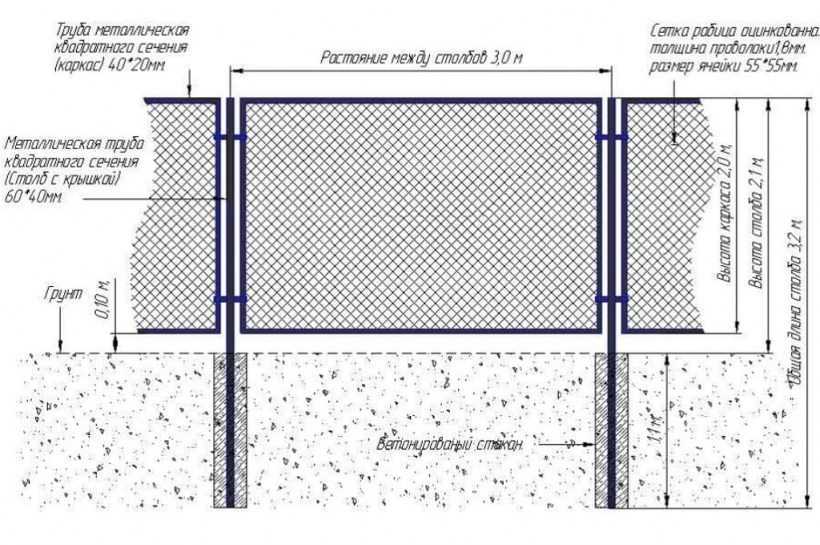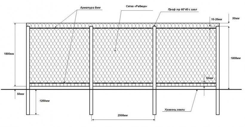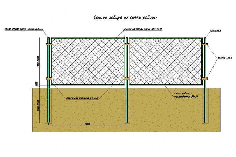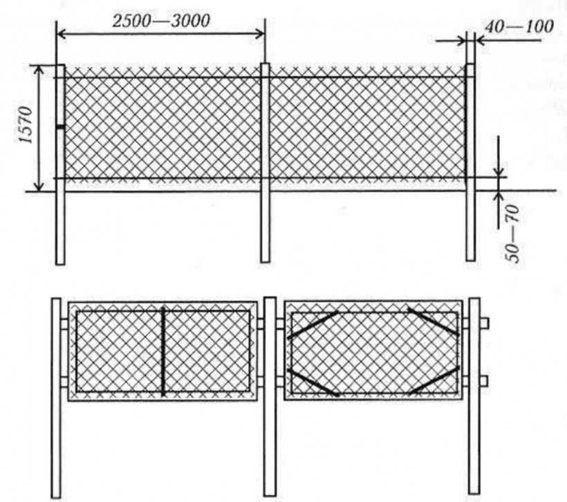 При воздвижении конструкции из сетки рабица не является обязательным этап прикрепления поперечных лаг. Можно закреплять сетку прямо на опорные установки. Главное – это хорошо натянуть покрытие, чтобы исключить провисания обшивки.