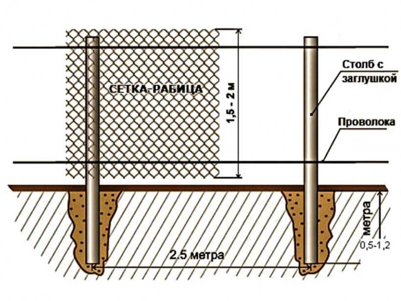 Рабица натягивается на несколько вариантов столбов – это могут быть металлические, деревянные, железобетонные основания. Иногда предварительно создают фундамент.