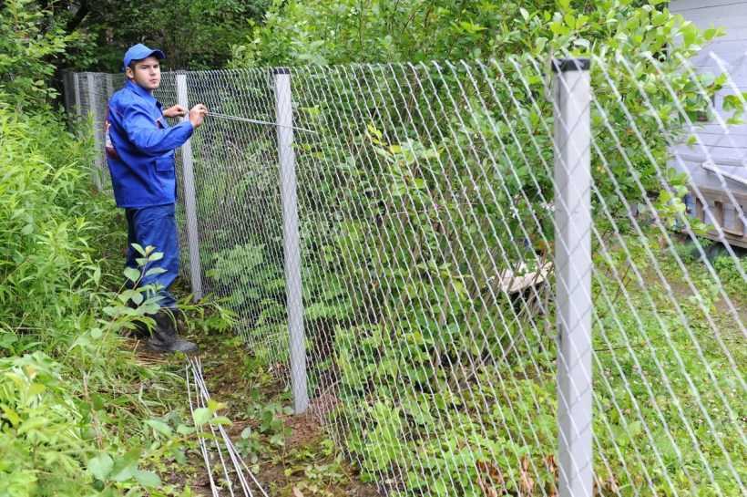 Натянув все прожилины, на них крепится сама сетка-рабица. В соответствии с правильной технологией монтажа такого забора, крепить ее нужно через одинаковые промежутки с помощью мягкой проволоки. Края сетки на опорных крайних столбах следует закрепить мягкой проволокой, обматывая ее несколько раз вокруг столба и захватывая при этом края сетки.