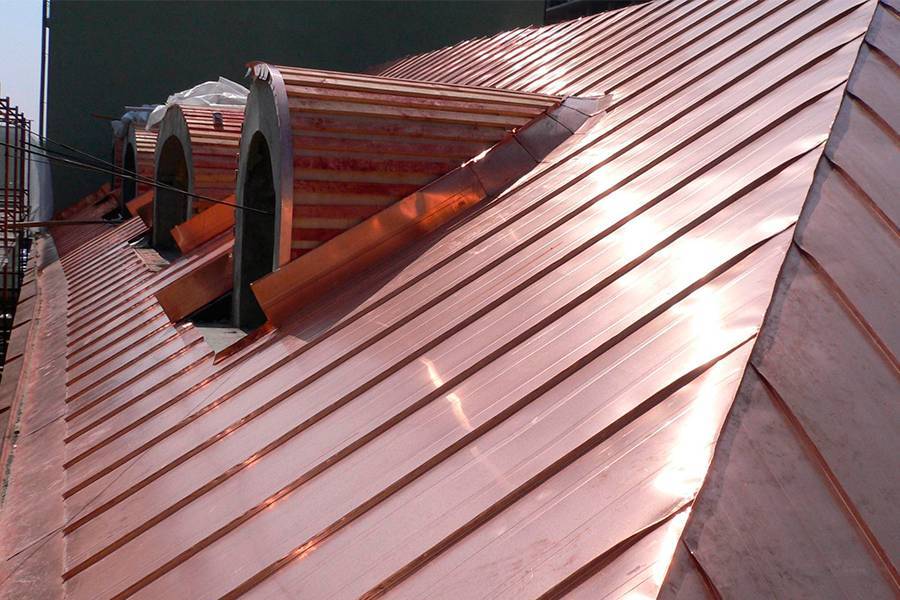 Легче, чем сталь, мягкий, гибкий и красивый металл. Пока кровля новая, она просто сияет на солнце. Со временем покрывается оксидной плёнкой (патиной) — приобретает коричневые, а затем зелёные оттенки. Гибкость металла позволяет использовать его при создании рельефа на крыше, волн, округлых башенок и других архитектурных изысков. Мягкость меди требует аккуратности при монтаже и уходе. Лучше пусть будет благородная патина, чем царапины на полированном металле.
