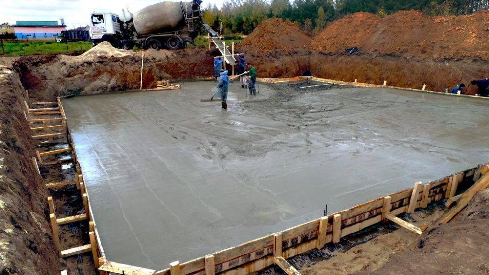 Для того, чтобы фундамент был прочным необходимо использовать миксер, который вмещает в себя от 6 до 8 кубометров раствора. Подача бетона происходит с помощью насоса.