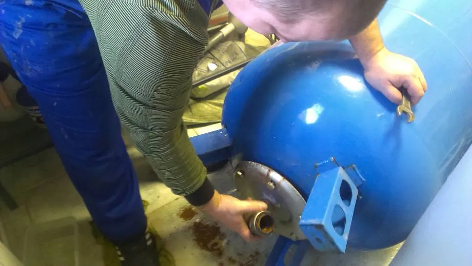 - После установки мембраны нужно возобновить внутреннее давление гидроаккумулятора. Для этого при помощи компрессора через ниппель с задней стороны бака закачивается воздух (следует добиться того же давления, которое было при работе насосной станции в обычном режиме, сверяясь с манометром).