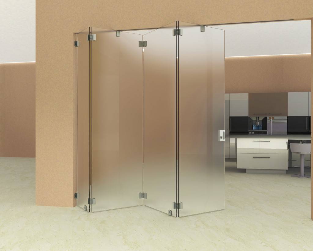 Складные – сложный поворотно-раздвижной механизм обеспечивает открывание в стеснённых условиях – все створки складываются в аккуратную вертикальную стопку у одного или двух импостов дверной коробки.