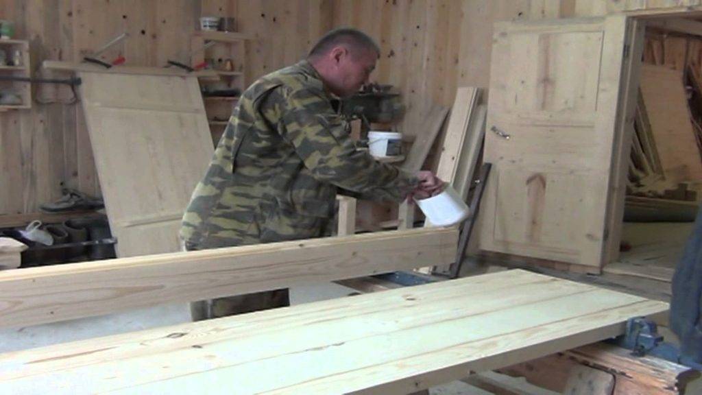 - Нанесение антисептика. Важный момент изготовления двери, поскольку древесина подвержена воздействию плесени и вредоносных микроорганизмов. На каждую часть дверной коробки и полотна нужно нанести специальный раствор, который предотвратит распространение инфекции.