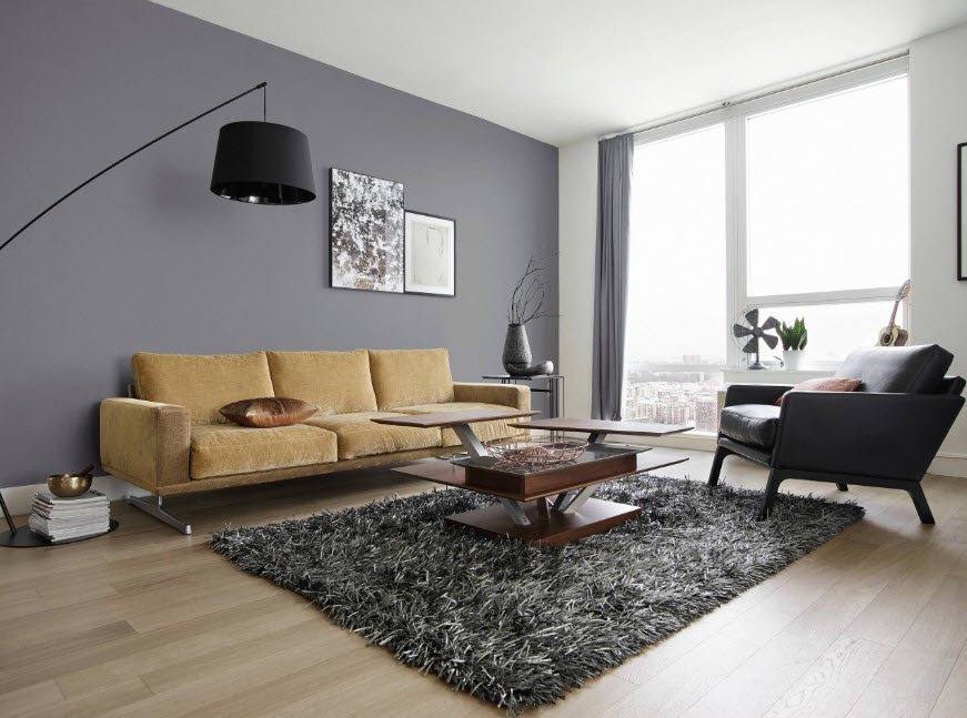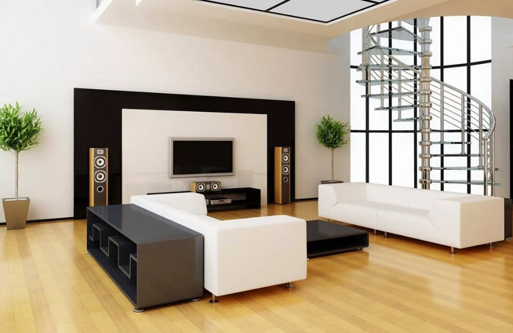 Выбирая цвета для фона, помните, что они должны между собой гармонировать. Беспроигрышным вариантом станет наличие белого цвета – он подчеркнет графичность интерьера, вы можете добавить и яркие цветовые акценты. Если есть возможность, сделайте в гостиной высокие окна – одна из стен может быть полностью стеклянной.