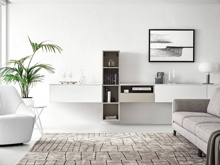 Минималистский дизайн использует сложные системы хранения для гостиной. Они часто принимают форму различных встроенных шкафов и шкафов. Поверхности шкафов должны гармонировать по цвету с оттенками других поверхностей интерьера. Минималистская простота, конечно же, требует четкой разбивки шкафов, стеллажей и полок, которые должны быть практичными и максимально удобными для пользователя.