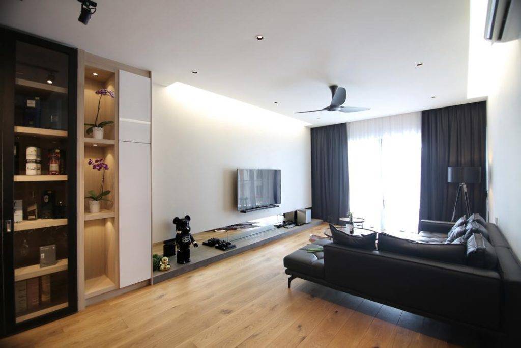 На фото пол в гостиной в стиле минимализм, выложенный деревянной паркетной доской.