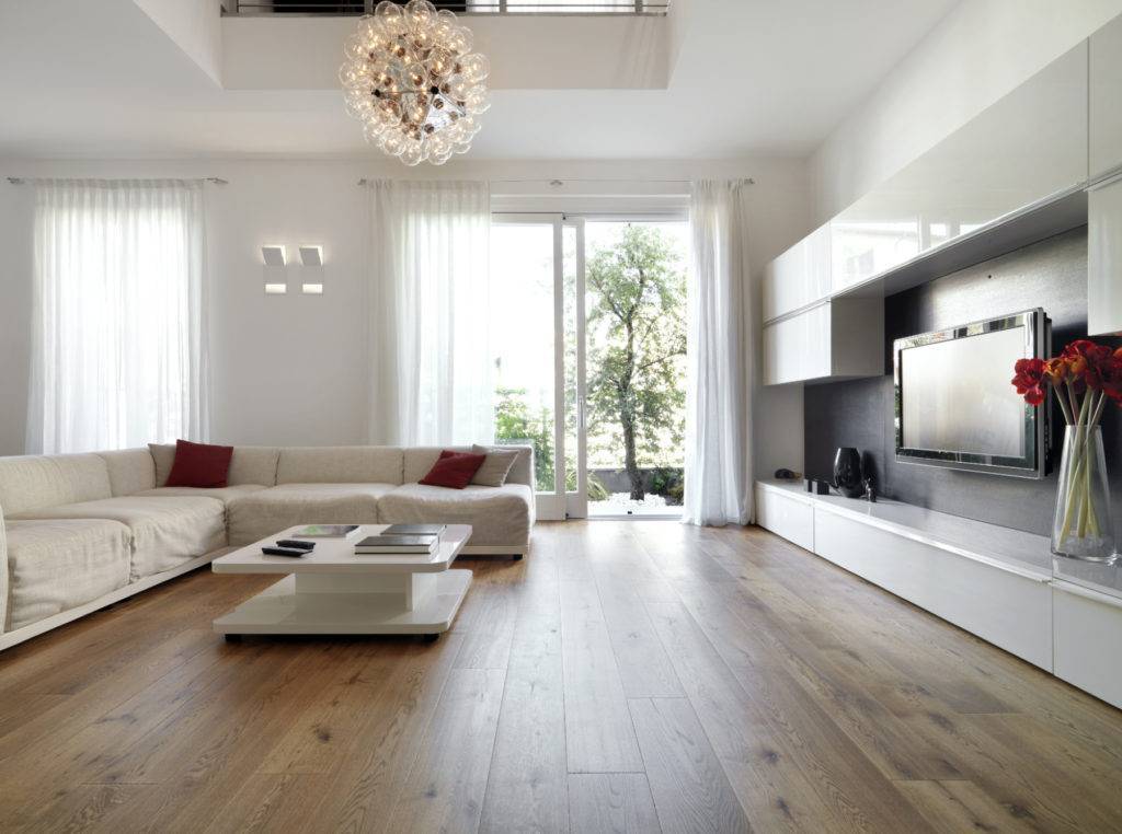 Лучшим решением для стиля минимализм является отделка в виде ламината или натурального дерева, которое смотрится изящно, тепло, уютно и благодаря древесной фактуре становится безупречным дополнением интерьера. Экологичным, роскошным и дорогим материалом считается паркет. Пол в минималистичной гостиной можно оформить доской в темных, светлых или выбеленных тонах.