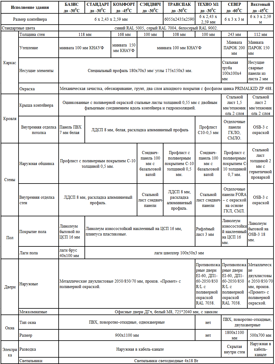 – термосопротивление ограждающих конструкций; – исполнения и модификации зданий; – габаритные размеры; – конструкция контейнеров и применяемые материалы.