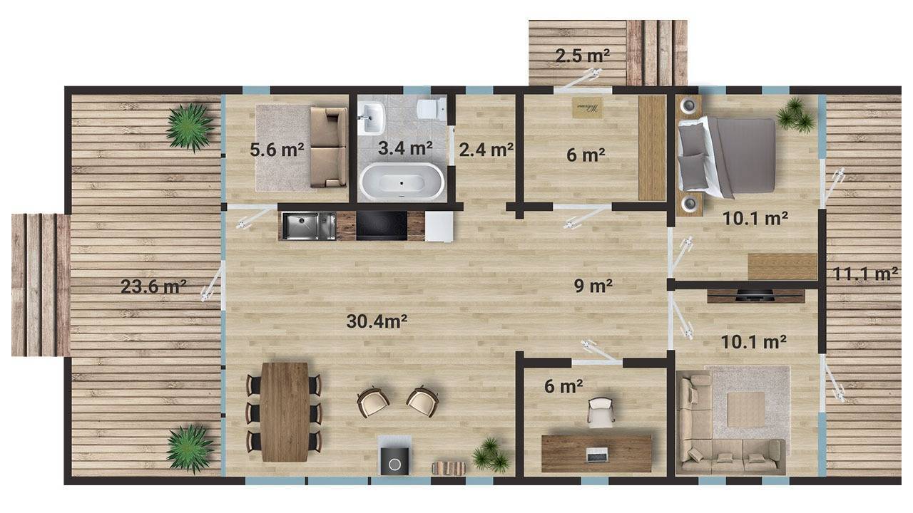 Как правило, полезная площадь сооружения из 3-х контейнеров позволяет обустроить отдельную спальную для взрослых, детскую комнату, просторную гостиную, отдельную кухню, санузел и душевую.