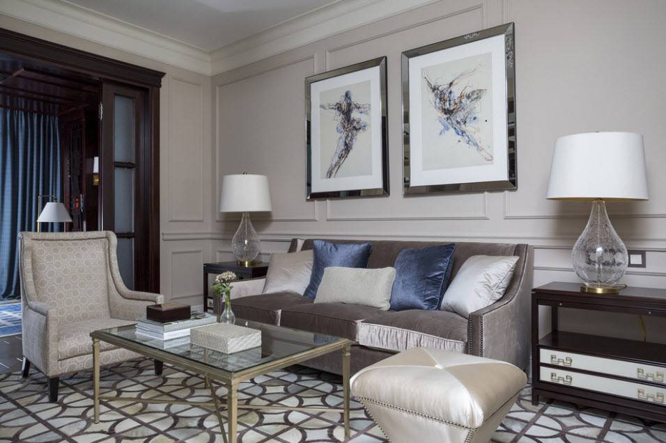 На фото гостиная в стиле неоклассика с прямоугольными молдингами в интерьере для разделения обоев за диваном.
