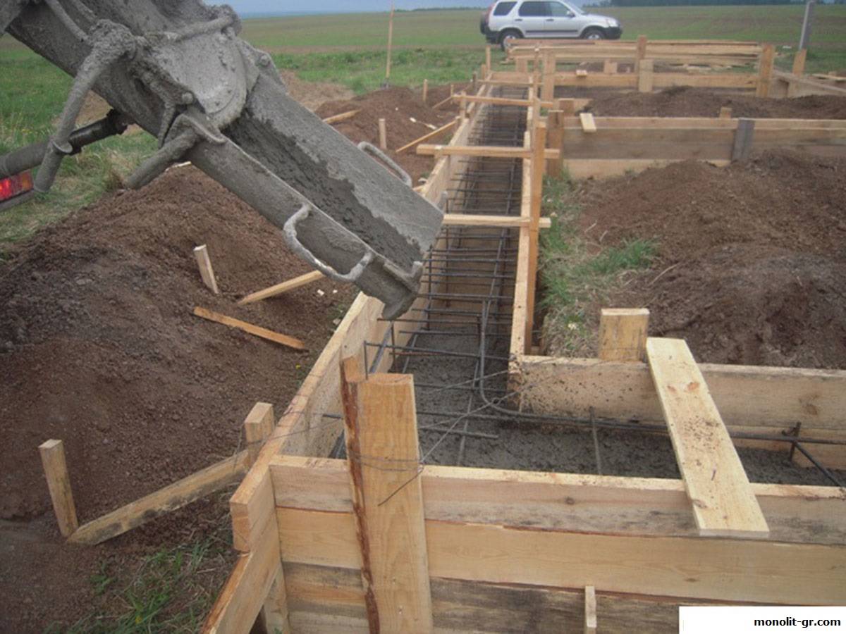 Однако такая основа уступает в надежности монолитному фундаменту. Чтобы создать монолитную конструкцию в предварительно вырытой опалубке возводят арматурный каркас. Подготовив форму, ее заливают бетоном и дают ему застыть.