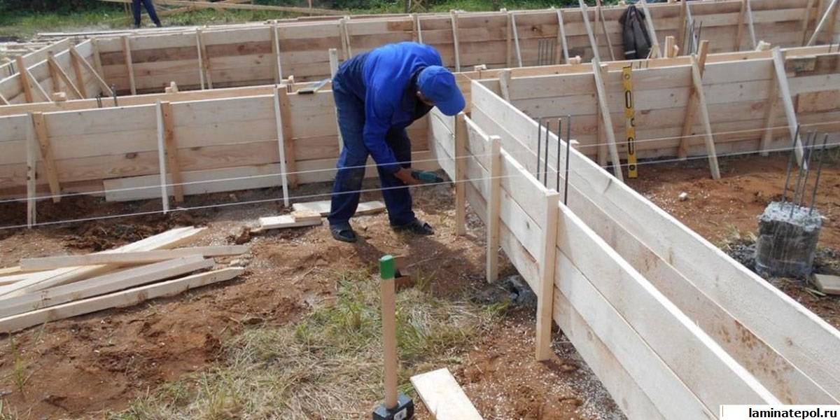 Следующий этап − устройство фундаментной опалубки. Перед установкой дно траншеи застилают рубероидом. Для сколачивания щитов используют разные материалы: