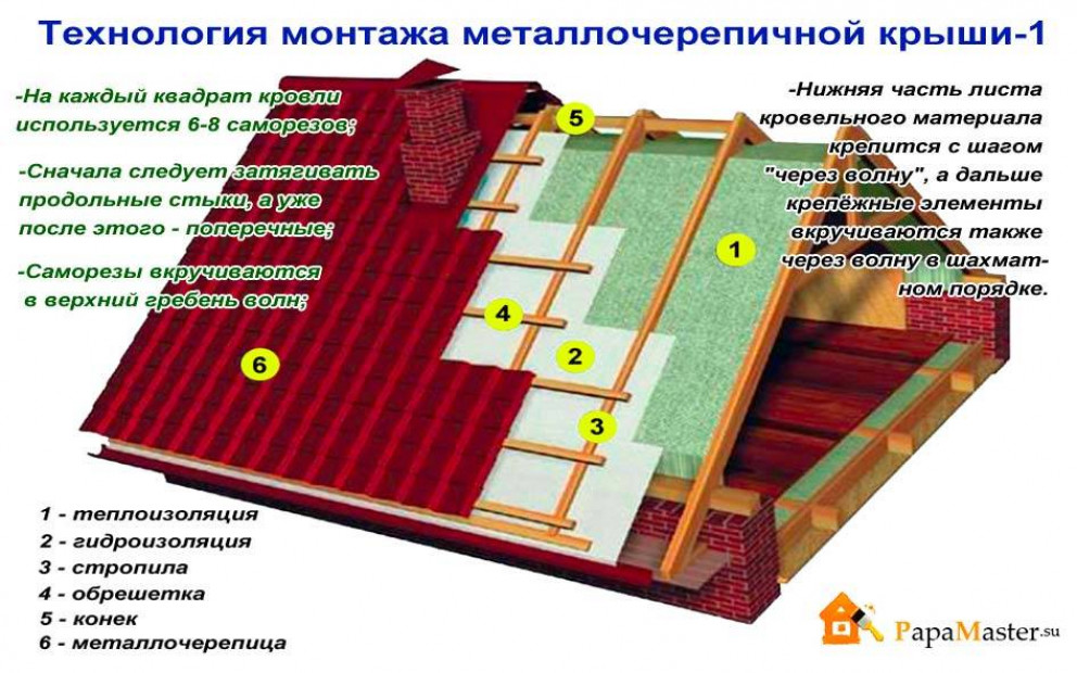 Конечная конструкция кровли из металлочерепицы будет иметь следующие упорядоченные слои: