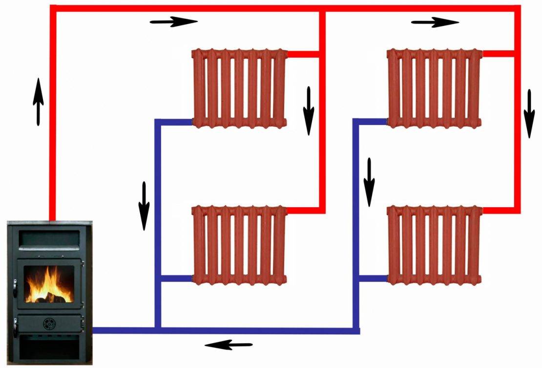 Горячая вода подается по одному трубопроводу, а остывшая – по другому. Таким образом обеспечивается равномерное распределение тепла по всем батареям.