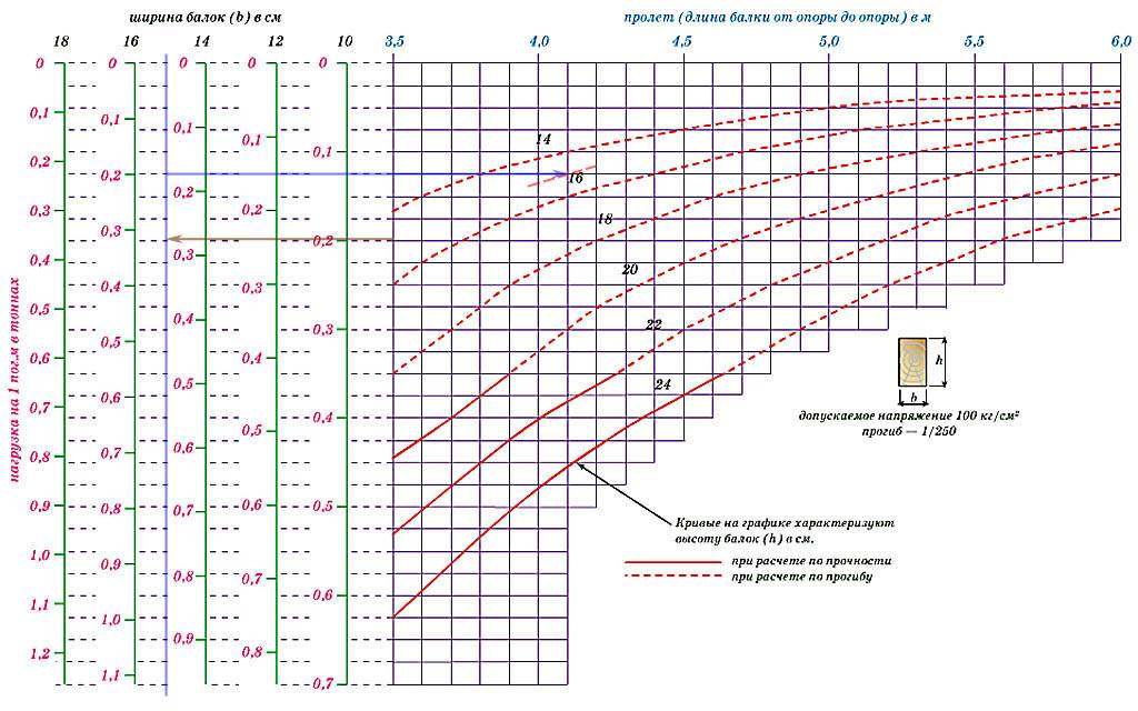 Прежде всего по номограмме на рис. определим предварительно допустимую погонажную (на метр длины) весовую нагрузку на балки. Пользуемся только пунктирными красными кривыми (расчет по прогибу 1:350), чтобы не влезть случайно в область опасных нагрузок. А чтобы не маяться с учетом местных нагрузок на древесину, балки с пролетом до 3,5 м считаем 3,5 метровыми.