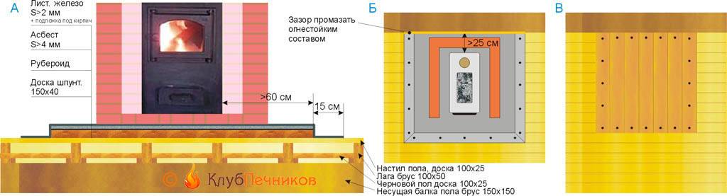 - перед дверцей топки необходимо дополнительное защитное пространство 50х70 см. Поверх него впоследствии укладывают чугунный лист;
