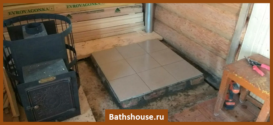 Если в бане залит бетонный пол, отделанный кафелем, стальную печь можно установить прямо на него. Что касается деревянных оснований, то они нуждаются в дополнительной защите.