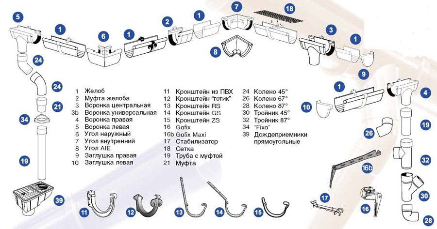 Более полный перечень элементов водостока представлен на фото