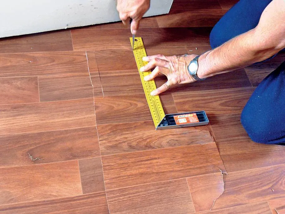 Очень важно убедиться в том, что напольное покрытие лежит ровно. Если на нем есть рисунок, то он должен располагаться параллельно стене. Производим обрезку второй стороны
