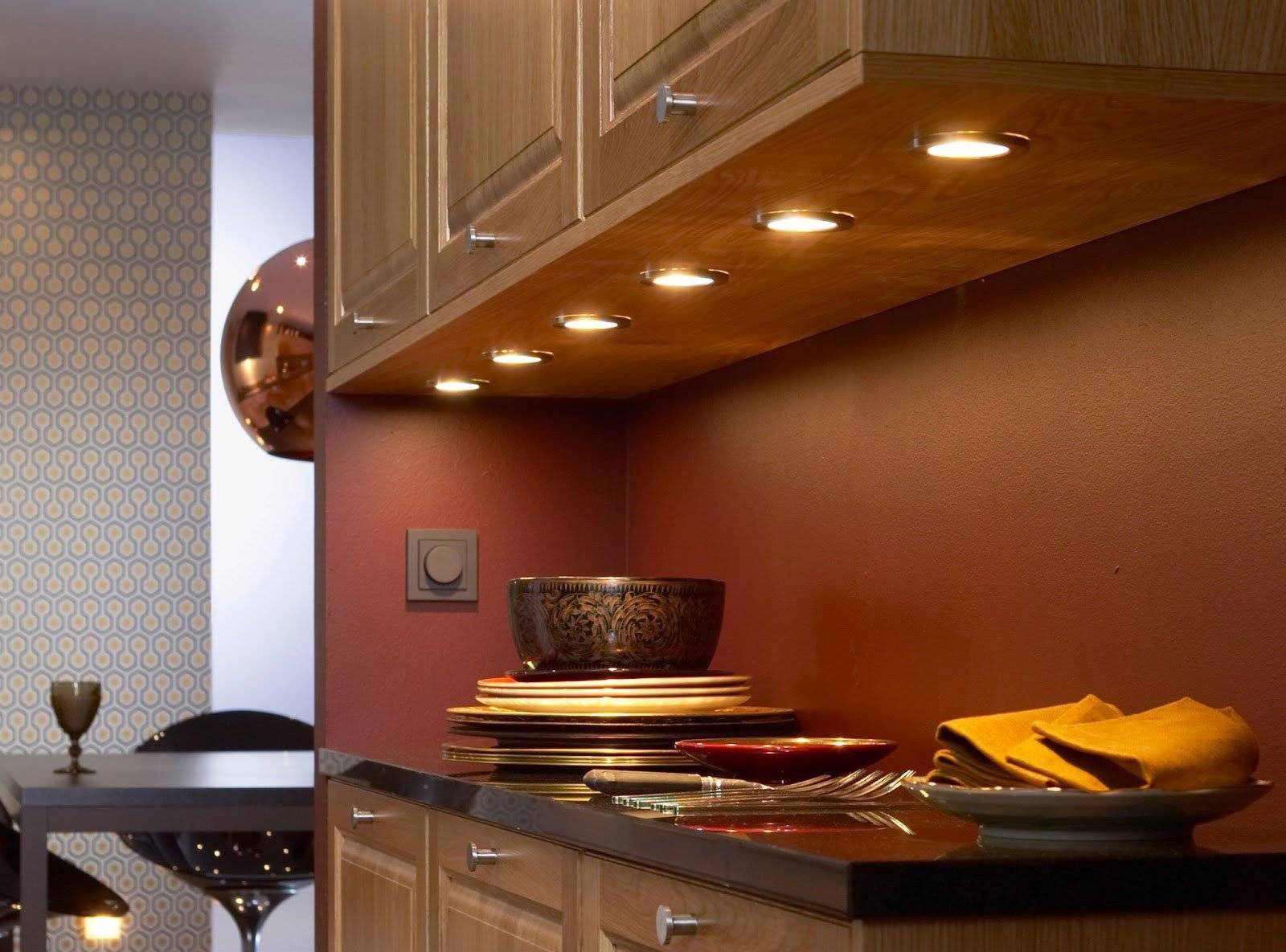 - На кухне основные участки помещения, нуждающиеся в подсветке, – обеденная или рабочая зоны, барная стойка.