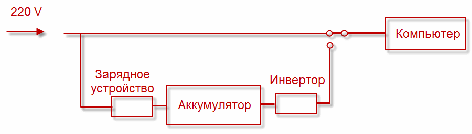 Резервная схема с внешним питанием подзаряжается непосредственно от электрической сети в стабильном режиме, когда нет перебоев и напряжение в сети находится в пределах 6 квт, а мощность не превышает 220вт. Если электропитание осуществляет скачки либо пропадает, то ИБП с аккумулятором переходят на собственные ресурсы при помощи инвертора.