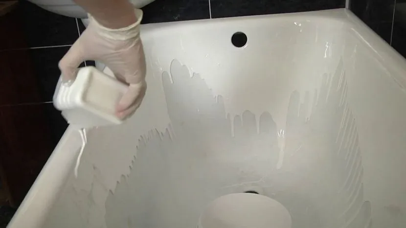 - Нанесение материала. Смесью начинают покрывать поверхность с краев, равномерно поливая стенки ванны. Как только акрил попадет в среднюю часть сантехники, процесс повторяют с последующим слоем.