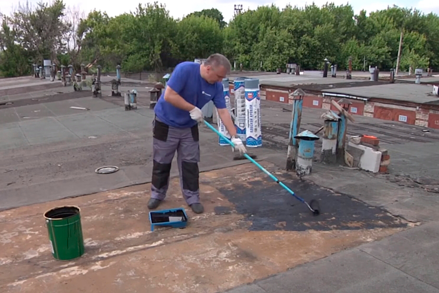 - После этого можно приступать к огрунтовке битумом. Битумная мастика создает водонепроницаемую пленку, которая защищает внутренние слои пирога от намокания и создает качественную основу с хорошей адгезией для последующей укладки мягкой кровли. В случае с покрытием битумом стяжки пленка препятствует слишком быстрому испарению влаги из бетона.