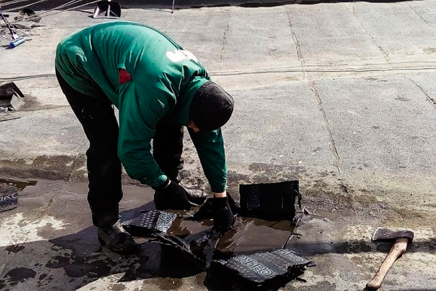 Любой ремонт следует начинать с подготовки поверхности. В случае с мягкой кровлей это подразумевает демонтаж старого покрытия и тщательную зачистку. Клеить новый материал поверх старого не то чтобы категорически запрещено, но совершенно нерационально. В этом случае вы рискуете в кратчайшие сроки испортить не только свежее покрытие, но и усугубить состояние поврежденных слоев кровельного пирога – утеплитель может начать гнить, что передастся деревянным элементам стропильной системы и т.д. Поэтому чтобы в будущем не раскошеливаться на полную замену кровли, лучше несколько часов посвятить демонтажу испорченного покрытия.