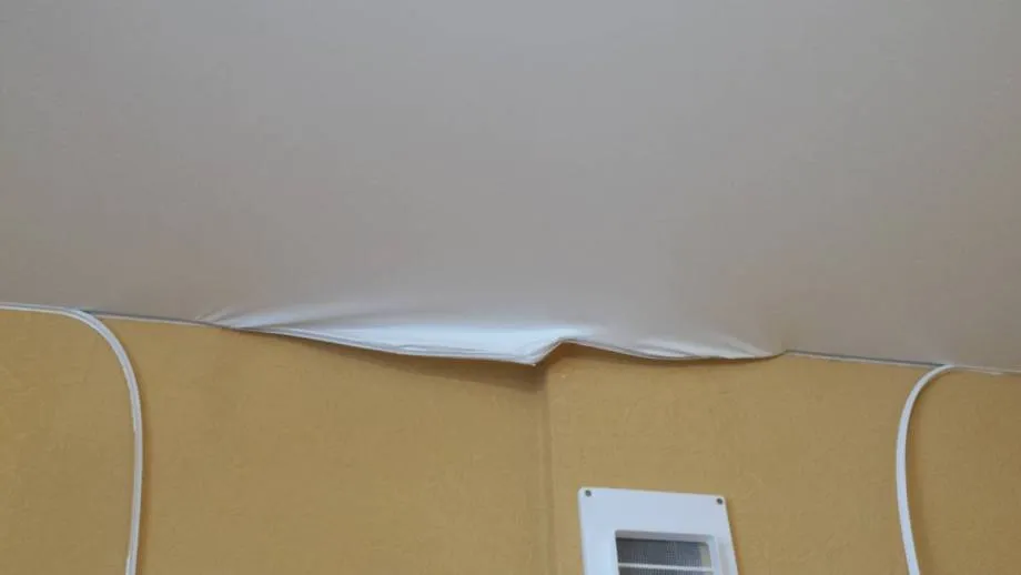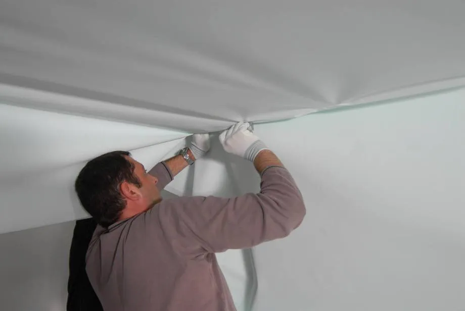 - Удаление натяжного материала. Натяните материал потолка в одном углу и аккуратно отсоедините его от профиля или карниза. Повторите эту операцию для всех сторон, постепенно снимая весь натяжной материал.