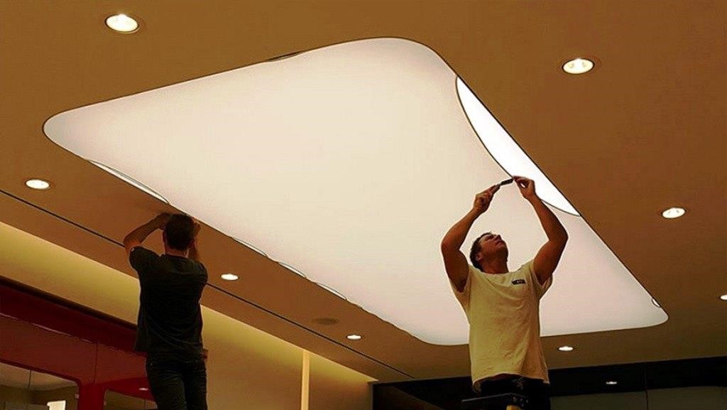 В заключение устанавливают потолочные светильники. Их фиксируют на специальные стойки заранее. Затем после натяжения полотна его прорезают ножом в необходимых местах. Эту работу выполняют с особой точностью. После установки светильников все работы по монтажу натяжного потолка закончены.