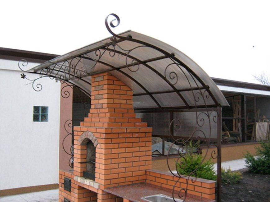 Материал гнется, поэтому из него легко своими руками можно сделать крышу над барбекю не только с прямым уклоном, но и арочную, криволинейную, сложной формы, с несколькими изгибами, что открывает широкие горизонты для дизайна пристройки к мангалу.