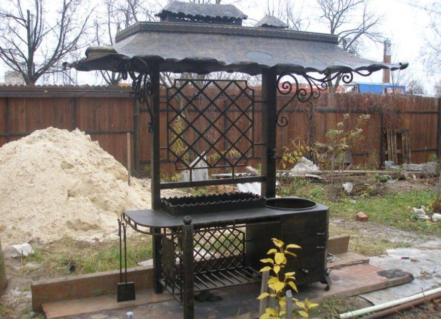 Навес над мангалом, фото переносной сварной конструкции из круглой трубы и профнастила