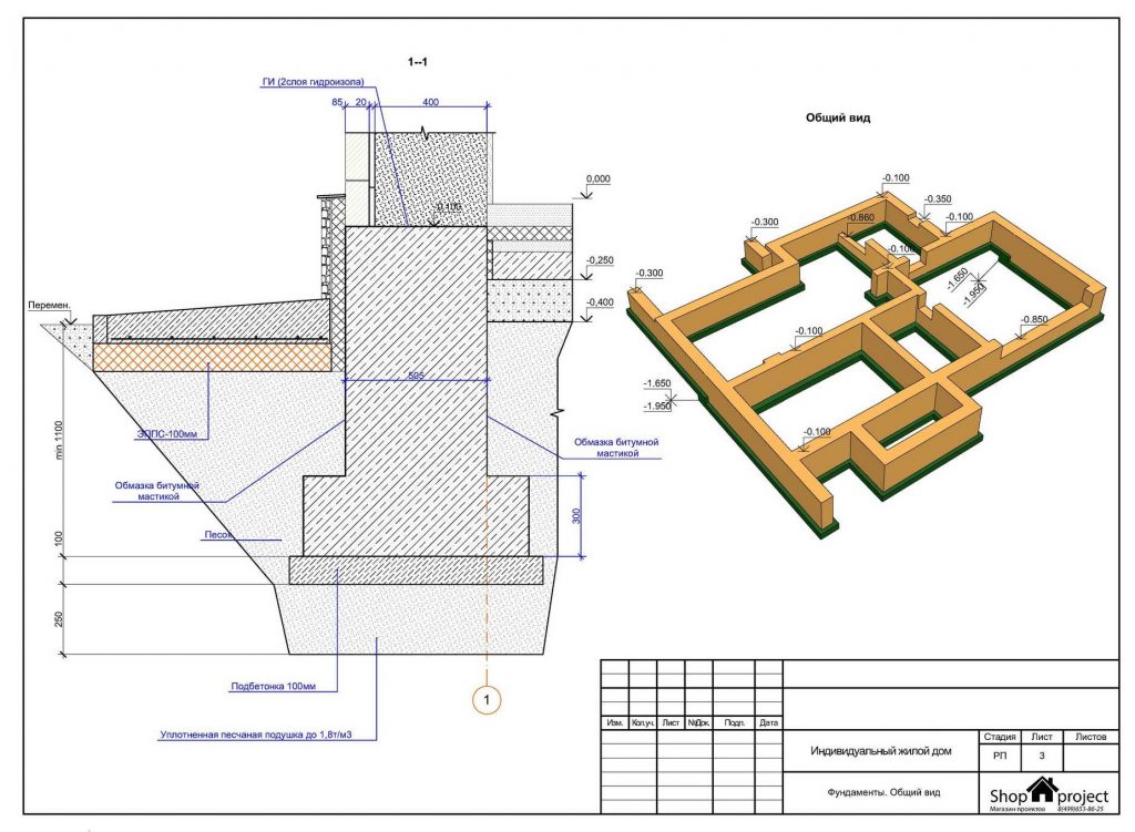 Схема мелкозаглубленного фундамента с гидроизоляцией на печанной подушке.